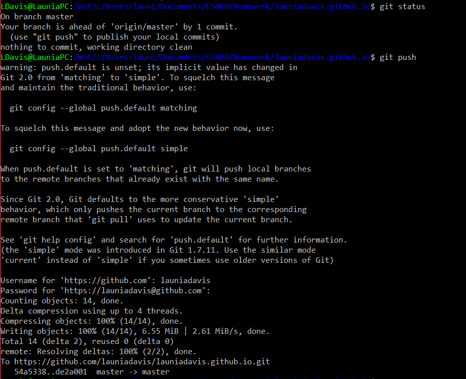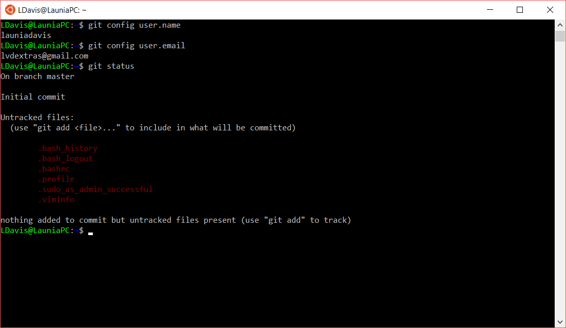 I already had a GitHub account from a previous class however I believed it would be easier for me, mentally, to create a new account that is designated for this class' assignments only. I already had Windows subsystem for Lynix set up. I went ahead and updated my user name and user email for GitHub and then I checked my status to make sure my repository was empty.