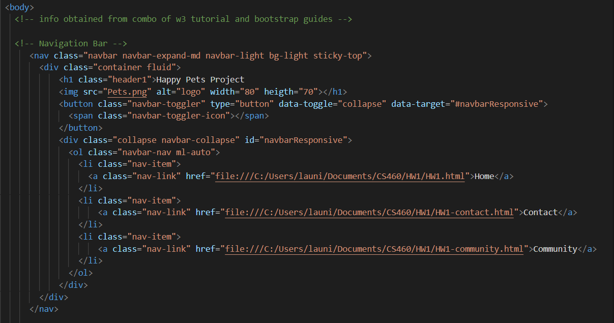 For this section of the code I followed along a tutorial, done by w3 newbie, of using bootsrtap to create a navigation bar. I really thought this was a cool navigation bar because when the size of the screen becomes smaller the navigation bar changes into a drop-down menu when selected. I had a few hiccups along the way in getting it to work properly and that wasn't until I nearly completed my website. The code for the navigation bar is in each of my three html files.