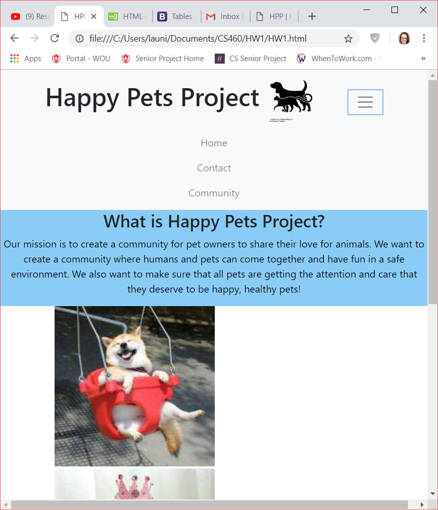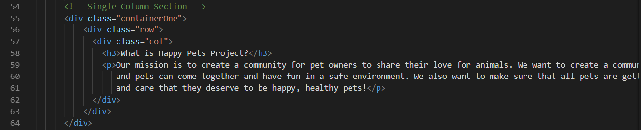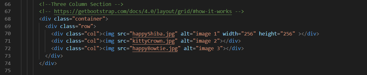 Inside the three column layout I decided to place the three images of pets. While working on this section I looked to bootstraps documentation as well as the w3 newbie tutorial.
