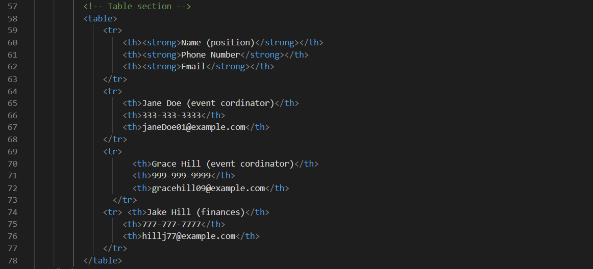 Next I went on to creating a table. This is in my HW1-contacts html file. I figured that using a table for my "contacts" would be the most reasonable way to use one. I had created with table with HTML and didn't realize till later that there was a way to format it in bootsrtap. I was in a pinch for time and decided to keep to the HTML.