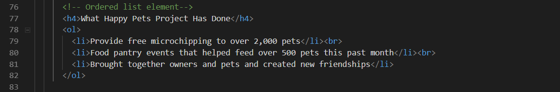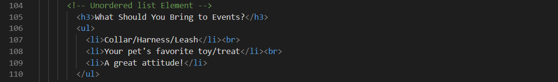 Moving along, we arrive to the creation of the tables. I chose to create an ordered and an unordered list. Similar to the table I had stuck to using HTML. My ordered list is in the HW1.html file and my unordered list is in the HW1-community.html file. Here is the code for the two lists below.