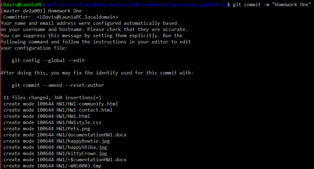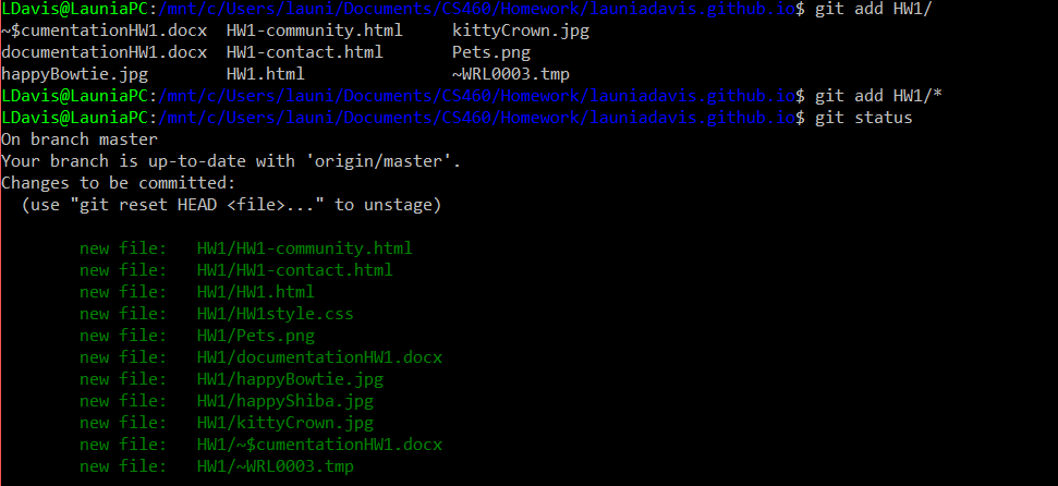 After completing the website now it was time to add and push all my files onto GitHub. I had quite a bit of trouble with this. I had a hard time getting into the directory I wanted to be my local repository. Eventualy, after pulling a few hairs from my head, I got to where I needed to be. I go on to add, commit and push my files to my repository. Below are images of this process.